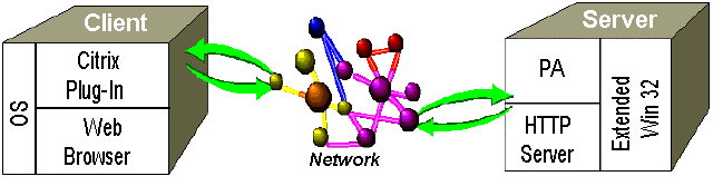 An integral component of the interface is the Citrix Winframe server software, which extends the capabilities of Windows NT. The Citrix Winframe technology acts as a redirectable layer between Windows NT applications and the Windows NT rendering layer. On the server machine, an application's display calls are intercepted by Winframe and redirected to a remote client machine. A Citrix compliant plug-in must be running on the client machine to interpret the incoming data stream and generate the application GUI. The plug-in for Windows 95 and Windows NT is freely available at http://www.citrix.com . The plug-in for UNIX is available for a nominal fee. The Winframe server is built into the operating system; a special version of Windows NT modified by Citrix must be purchased for the server machine.